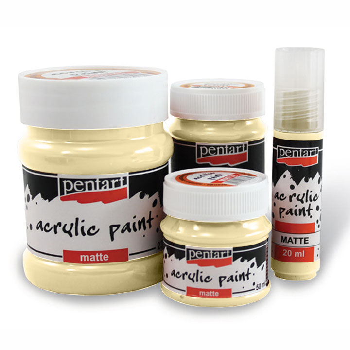 Akrylová barva značky PENTART, vyrobená na vodní bázi s matným efektem, vodou ředitelná, nabízející širokou škálu barev. Barva má vysokou krycí schopnost, po zaschnutí zůstává voděodolná. Ideální na tyto povrchy: dřevo, papír, kámen, plátno, papír, terakota, sádra, polystyren a další. Objem: 230 ml. Dostupná v 28 barevných odstínech.