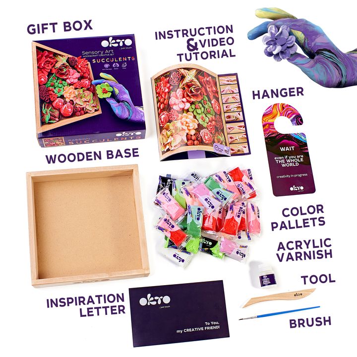 Modelovací sada OKTO v dřevěném rámu Sensory Art - Succulents je určena pro dospělé, kteří hledají originální dárek nebo příjemnou aktivitu pro trávení volného času. Sada nabízí relaxační proces modelování květin, během kterého můžete vytvořit jedinečnou kompozici interiéru. V balení naleznete vše potřebné k vytvoření modelovaných květin: dřevěný základ-rámeček, návod k použití, dřevěnou modelovací pomůcku, samotvrdnoucí pastu, akrylový lak a štětec. Vzduchová hlína po 10 minutách na vzduchu částečně ztrácí své vlastnosti, proto se doporučuje nenechávat balíčky s jílem otevřená. Hotovou kompozici doporučujeme sušit po dobu 48 hodin, poté ji můžete podle potřeby překrýt ochranným lakem. Vhodný je lesklý nebo matný akrylový vodou ředitelný lak. Samotuhnoucí hmota je zdravotně nezávadná a netoxická, nezpůsobuje alergie. Před použitím si prosím pečlivě přečtěte pokyny. Tato modelovací sada není hračka a je určena pouze pro dospělé. Je ideální pro dekoraci interiérů nebo jako kreativní terapie, nabízí nejen estetické potěšení, ale také příležitost k rozvoji manuálních dovedností a kreativního vyjádření.