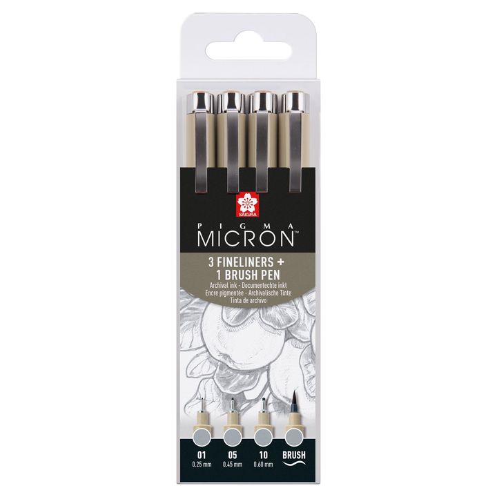 Úvod » Sada technických per Sakura Pigma Micron 3 fineliners a brush pen | šedé odstíny