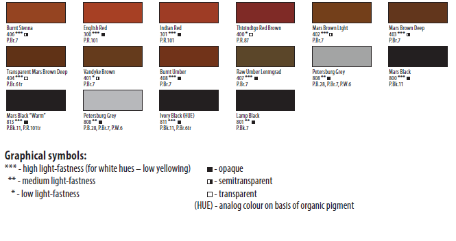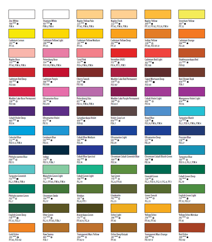 Profesionální olejové barvy St. Petersburg, jejichž barevná paleta je složena z tradičních barevných základů na bázi přírodních zemin, kadmia, kobaltu a železooxidových pigmentů. Jemně disperzní, pastovité umělecké barvy kategorie Master Class jsou vysoce ceněny pro svou barevnou čistotu, vysokou světlostálost a výbornou mísitelnost.